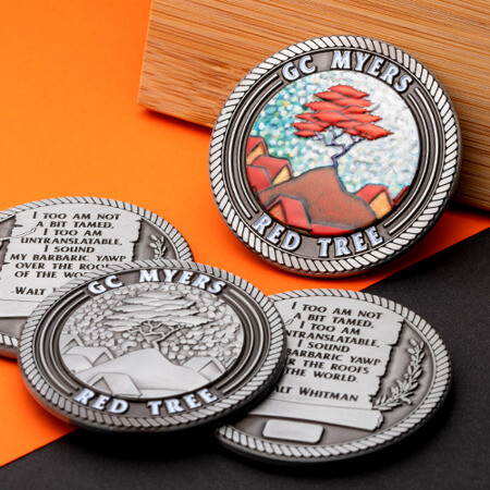 Many of our customers opt to let the metal plating of their coins act as the primary color for a 3D design. We recommend antique plating options because the darker tone of the metal allows the details of the 3D to really stand out. However, when we add the UV printing option, it takes 3D to a whole new level.