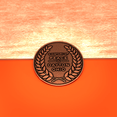 The back of these coins bear “A History of Peace in Dayton, Ohio”, the title of a book that discusses the centuries of history from Dayton and the impression that history has made working towards peace.