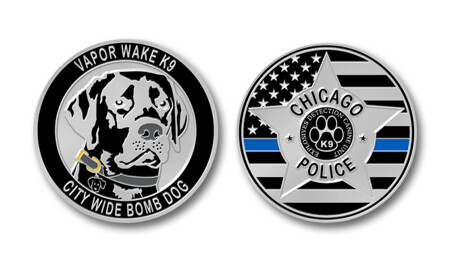 It should come as no surprise that one of the most represented designs of virtually every K-9 challenge coin is a depiction of a police dog. However, a lot of K-9 units take it a step further with their coins adding images of specific police dogs from their unit to a coin’s design. This personalizes a unit’s challenge coin to a specific unit while paying homage to both the unique training of the unit and their canine partners. For example, take a look at the challenge coin we designed for the Chicago Police Department’s (CPD) K-9 Unit. Subtle design elements including the thin blue line over the U.S. flag found on the coin’s reverse are recognizable law enforcement symbols reflecting the coin’s purpose to honor CPD officers and other law enforcement officers. However, what makes the coin stand out as a K-9 Unit coin is the main design on the coin’s obverse, an image depicting one of the department’s new Vapor Wake bomb detection dogs. The image, based off a photo of a CPD police dog, resonates more strongly as a specific symbol for responsibilities of CPD K-9 officers and better honors their unique role than a coin with more general police emblems or symbols would have.
