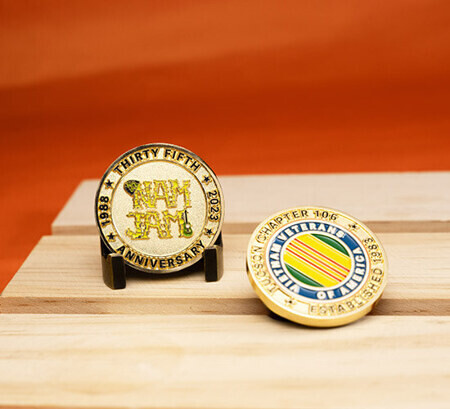 Choose from bronze, silver, gold, or brass for your coin’s material, then select from a variety of finishes including antique, polished, or sandblast. This lets you impart a traditional or contemporary look to your coins, reflecting the right tone for your organization. You can choose a classic round coin or create it into any shape you please, as well as choosing from our vast color options.